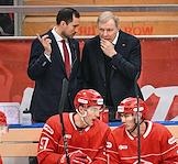 Континентальная Хоккейная Лига (КХЛ). Матч между командами "Спартак" (Москва) - ЦСКА (Москва) на стадионе "Мегаспорт". Главный тренер команды "Спартак" Алексей Жамнов (в центре, справа) и старший тренер команды "Спартак" Александр Барков (в центре, слева) во время матча.