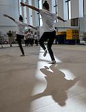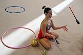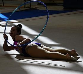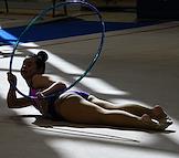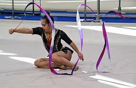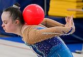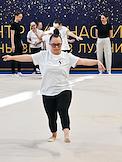 Открытая тренировка по художественной гимнастике для детей с синдромом дауна, организованная международным Фондом развития и поддержки спорта, художественной гимнастики и социальных проектов для детей с интеллектуальными нарушениями, во Дворце гимнастики Ирины Винер. Чемпионка мира по художественной гимнастики среди сеньорок Ольга Филимонова на тренировке.