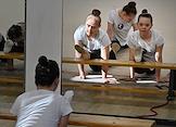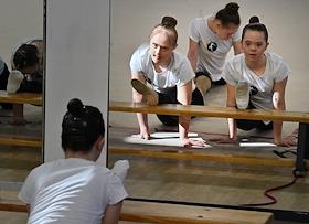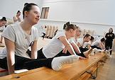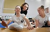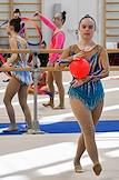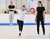 Открытая тренировка по художественной гимнастике для детей с синдромом дауна, организованная международным Фондом развития и поддержки спорта, художественной гимнастики и социальных проектов для детей с интеллектуальными нарушениями, во Дворце гимнастики Ирины Винер. Чемпионка мира по художественной гимнастике среди юниоров Варвара Смирнова (слева) и чемпионка мира по художественной гимнастике среди сеньорок Ольга Филимонова (в центре) во время тренировки.