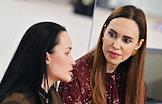 Открытая тренировка по художественной гимнастике для детей с синдромом дауна, организованная международным Фондом развития и поддержки спорта, художественной гимнастики и социальных проектов для детей с интеллектуальными нарушениями, во Дворце гимнастики Ирины Винер. Олимпийская чемпионка по художественной гимнастике Анастасия Татарева (слева) и попечитель благотворительного фонда "Жизнь как чудо" Юлианна Винер (справа) на тренировке.