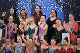 Открытая тренировка по художественной гимнастике для детей с синдромом дауна, организованная международным Фондом развития и поддержки спорта, художественной гимнастики и социальных проектов для детей с интеллектуальными нарушениями, во Дворце гимнастики Ирины Винер. Олимпийская чемпионка по художественной гимнастике Анастасия Татарева (верхний ряд, слева) и попечитель благотворительного фонда "Жизнь как чудо" Юлианна Винер (верхний ряд, в центре) на тренировке.