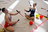Открытая тренировка по художественной гимнастике для детей с синдромом дауна, организованная международным Фондом развития и поддержки спорта, художественной гимнастики и социальных проектов для детей с интеллектуальными нарушениями, во Дворце гимнастики Ирины Винер. Чемпионки мира по художественной гимнастике среди юниоров Варвара Смирнова (слева) и Ольга Филимонова (справа) во время тренировки.