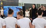 Открытая тренировка по художественной гимнастике для детей с синдромом дауна, организованная международным Фондом развития и поддержки спорта, художественной гимнастики и социальных проектов для детей с интеллектуальными нарушениями, во Дворце гимнастики Ирины Винер. Олимпийская чемпионка по художественной гимнастике Анастасия Татарева на тренировке.