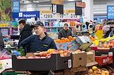 Магазин сети гипермаркетов "Лента". Жанровая фотография. Покупатели и сотрудник гипермаркета в торговом зале магазина.