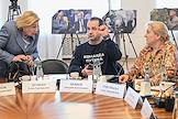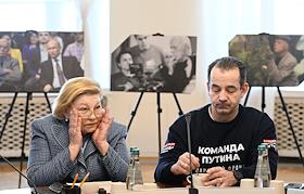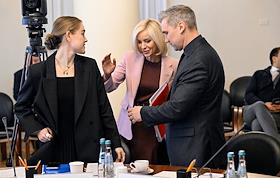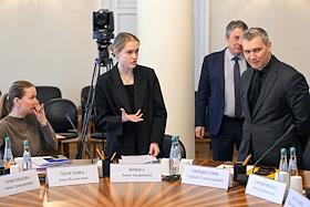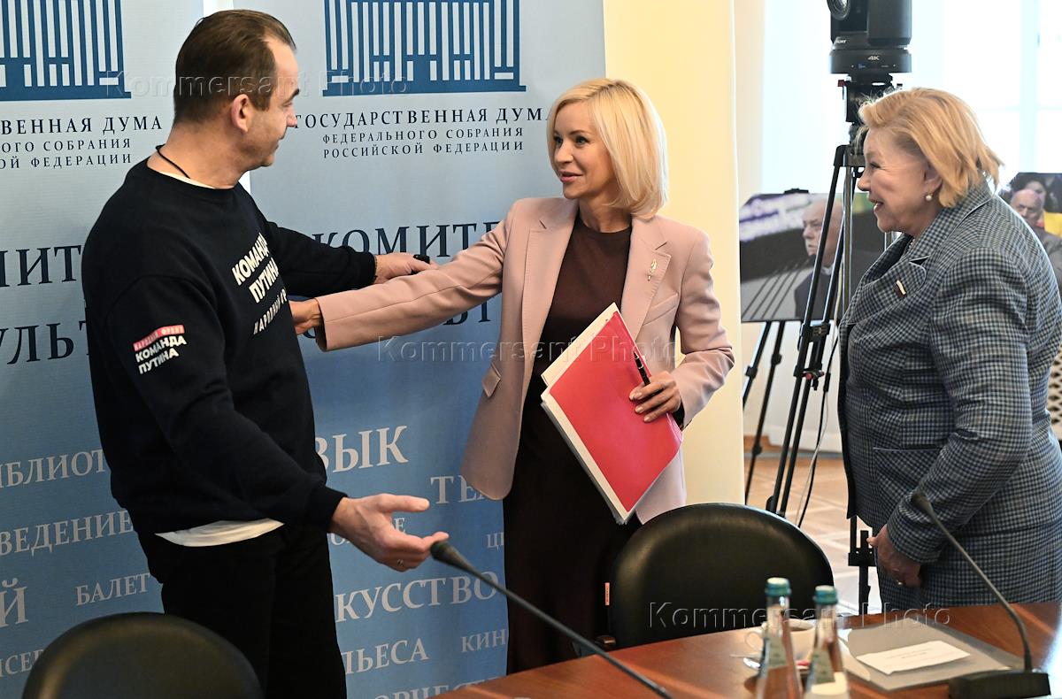 Заседание комитета по культуре Государственной думы (ГД) России в ГД России. Слева направо: первый заместитель председателя комитета ГД России по культуре Дмитрий Певцов, председатель комитета ГД России по культуре Ольга Казакова и первый заместитель председателя комитета ГД России по культуре Елена Драпеко перед началом заседания.
