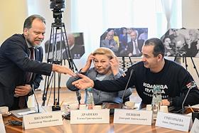 Заседание комитета по культуре Государственной думы (ГД) России в ГД России. Слева направо: первые заместители председателя комитета ГД России по культуре Елена Драпеко, Дмитрий Певцов и профессор кафедры фортепиано Российской академии музыки имени Гнесиных Анна Григорьева во время заседания.