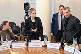 Заседание комитета по культуре Государственной думы (ГД) России в ГД России. Слева направо: первые заместители председателя комитета ГД России по культуре Александр Шолохов, Елена Драпеко и Дмитрий Певцов перед началом заседания.