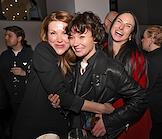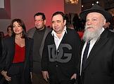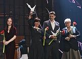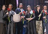 Церемония вручения XIV ежегодной премии газеты The Art Newspaper Russia в театре "Мастерская Петра Фоменко". Актеры Мария Смольникова (в центре), Александр Яценко (второй справа) и Ян Гэ (справа) и лидер группы "Мегаполис" Олег Нестеров (слева) на церемонии.