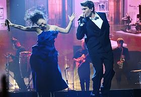 Церемония вручения XIV ежегодной премии газеты The Art Newspaper Russia в театре "Мастерской Петра Фоменко". Актриса и певица Ян Гэ (слева) и актер Анатолий Кормановский (справа) во время выступления на церемонии.