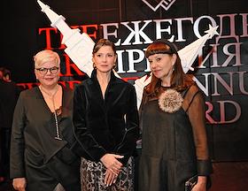Церемония вручения XIV ежегодной премии газеты The Art Newspaper Russia в театре "Мастерская Петра Фоменко". Слева направо: главный редактор The Art Newspaper Russia Милена Орлова, издатель российской газеты The Art Newspaper Russia Ольга Ярутина и генеральный директор газеты The Art Newspaper Russia Татьяна Сахокия на церемонии.