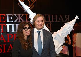 Церемония вручения XIV ежегодной премии газеты The Art Newspaper Russia в театре "Мастерская Петра Фоменко". Президент Федерации еврейских общин России (ФЕОР), генеральный директор Еврейского музея и центра толерантности Александр Борода (слева) и директор Центра Вознесенского Ольга Варцева (справа) во время церемонии.