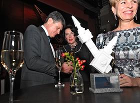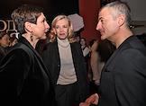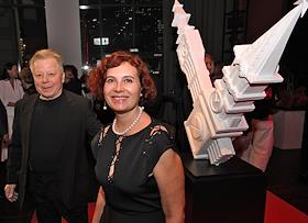 Церемония вручения XIV ежегодной премии газеты The Art Newspaper Russia в театре "Мастерская Петра Фоменко". Директор Мультимедиа Арт Музея Ольга Свиблова (слева) и основатель и генеральный директор компании "Экспо-парк Выставочные проекты" Василий Бычков (в центре) на церемонии.