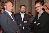 Церемония вручения XIV ежегодной премии газеты The Art Newspaper Russia в театре "Мастерская Петра Фоменко". Слева направо: кураторы выставки "Темная оттепель" Иван Ярыгин, Дмитрий Хворостов и Татьяна Сохарева на церемонии.