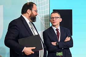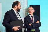 Рабочая поездка председателя правительства России Михаила Мишустина в Казахстан. Заседание Евразийского межправительственного совета в расширенном составе. Министр цифрового развития, связи и массовых коммуникаций России Максут Шадаев (слева) и статс-секретарь – заместитель министра финансов России Алексей Сазанов (справа) перед началом заседания.