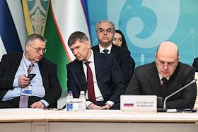 Рабочая поездка председателя правительства России Михаила Мишустина в Казахстан. Заседание Евразийского межправительственного совета в расширенном составе. Слева направо: заместитель председателя правительства России Алексей Оверчук, министр экономического развития России Максим Решетников, заместитель руководителя аппарата правительства России Эльмир Тагиров и председатель правительства России Михаил Мишустин во время заседания.