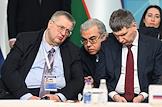 Рабочая поездка председателя правительства России Михаила Мишустина в Казахстан. Заседание Евразийского межправительственного совета в расширенном составе. Слева направо: заместитель председателя правительства России Алексей Оверчук, заместитель руководителя аппарата правительства России Эльмир Тагиров и министр экономического развития России Максим Решетников во время заседания.