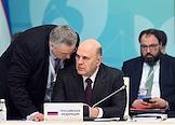 Рабочая поездка председателя правительства России Михаила Мишустина в Казахстан. Международный цифровой форум "Digital Qazaqstan 2026" в культурном центре QYZGALDAQ SARAIY. Председатель правительства России Михаил Мишустин (в центре) во время пленарной сессии.