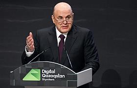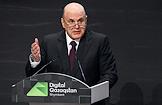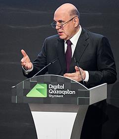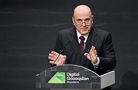 Рабочая поездка председателя правительства России Михаила Мишустина в Казахстан. Международный цифровой форум "Digital Qazaqstan 2026" в культурном центре QYZGALDAQ SARAIY. Председатель правительства России Михаил Мишустин во время пленарной сессии.