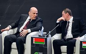 Рабочая поездка председателя правительства России Михаила Мишустина в Казахстан. Международный цифровой форум "Digital Qazaqstan 2026" в культурном центре QYZGALDAQ SARAIY. Председатель правительства России Михаил Мишустин (слева) и премьер-министр Белоруссии Александр Турчин (справа) во время пленарной сессии.