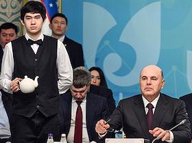 Рабочая поездка председателя правительства России Михаила Мишустина в Казахстан. Международный цифровой форум "Digital Qazaqstan 2026" в культурном центре QYZGALDAQ SARAIY. Пленарная сессии.