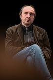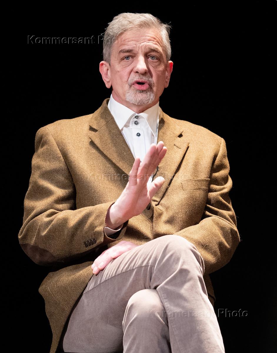 Встреча с артистами спектакля "Чайка" Малого драматического театра (МДТ) Европы на Основной сцене МДТ в рамках Всемирного дня театра. Актер Олег Рязанцев на сцене во время встречи.