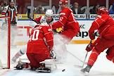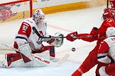 Континентальная Хоккейная Лига (КХЛ). Плей-офф 1/8 финала Кубка Гагарина. Матч между командами "Спартак" (Москва) - "Локомотив" (Ярославль) на стадионе "Мегаспорт". Вратарь команды "Локомотив" Даниил Исаев (слева) во время матча.