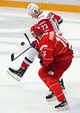 Континентальная Хоккейная Лига (КХЛ). Плей-офф 1/8 финала Кубка Гагарина. Матч между командами "Спартак" (Москва) - "Локомотив" (Ярославль) на стадионе "Мегаспорт". Игрок команды "Спартак" Данил Пивчулин (справа) во время матча.