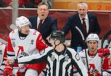 Континентальная Хоккейная Лига (КХЛ). Плей-офф 1/8 финала Кубка Гагарина. Матч между командами "Спартак" (Москва) - "Локомотив" (Ярославль) на стадионе "Мегаспорт". Главный тренер команды "Локомотив" Боб Хартли (справа) и тренер команды "Локомотив" Майк Пелино (второй слева) во время матча.