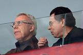 Континентальная Хоккейная Лига (КХЛ). Плей-офф 1/8 финала Кубка Гагарина. Матч между командами "Спартак" (Москва) - "Локомотив" (Ярославль) на стадионе "Мегаспорт". Первый заместитель председателя комитета Государственной думы России по экологии, природным ресурсам и охране окружающей среды Вячеслав Фетисов (слева) и заместитель мэра Москвы в правительстве Москвы по вопросам региональной безопасности и информационной политики Александр Горбенко (справа) во время матча на трибуне стадиона.