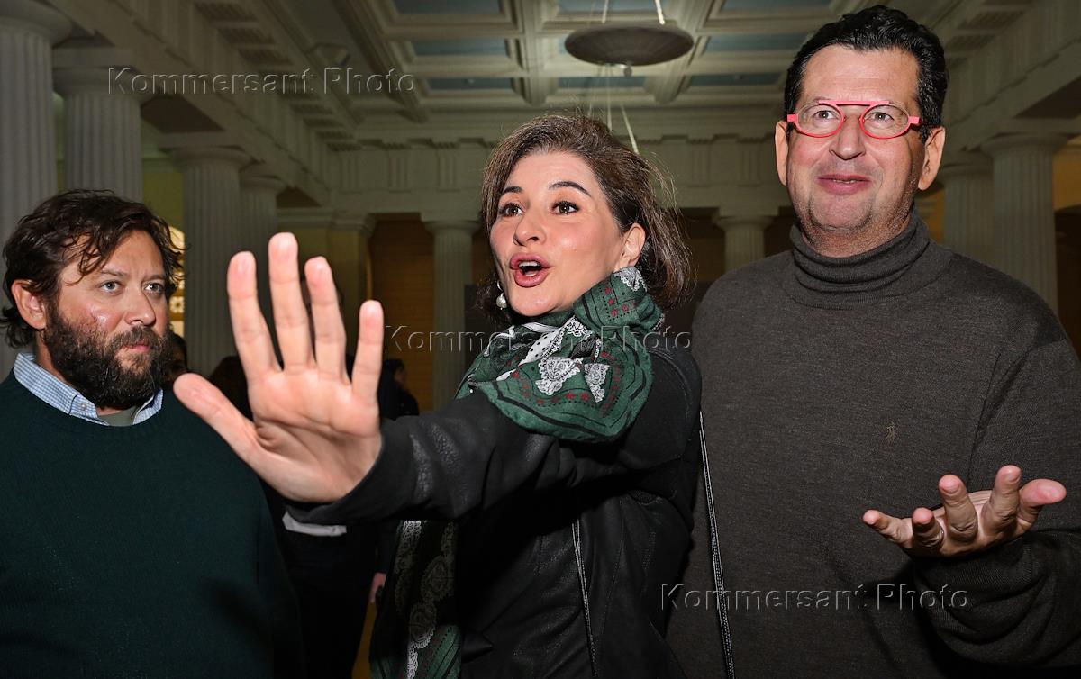 Концерт в честь 90-летия Нижегородского академического театра оперы и балета имения А.С.Пушкина при поддержке фонда RA в Большом зале консерватории. Прием в отеле Stella di Mosca. Слева направо: генеральный директор музея "АТОМ" Елена Мироненко, художественный руководитель Нижегородского государственного академического театра оперы и балета имени А.С.Пушкина Алексей Трифонов и владелица пространства 50/50 Body&Mind Patriki, попечитель благотворительного фонда "Жизнь как чудо" Алина Ковалева на приеме после концерта.