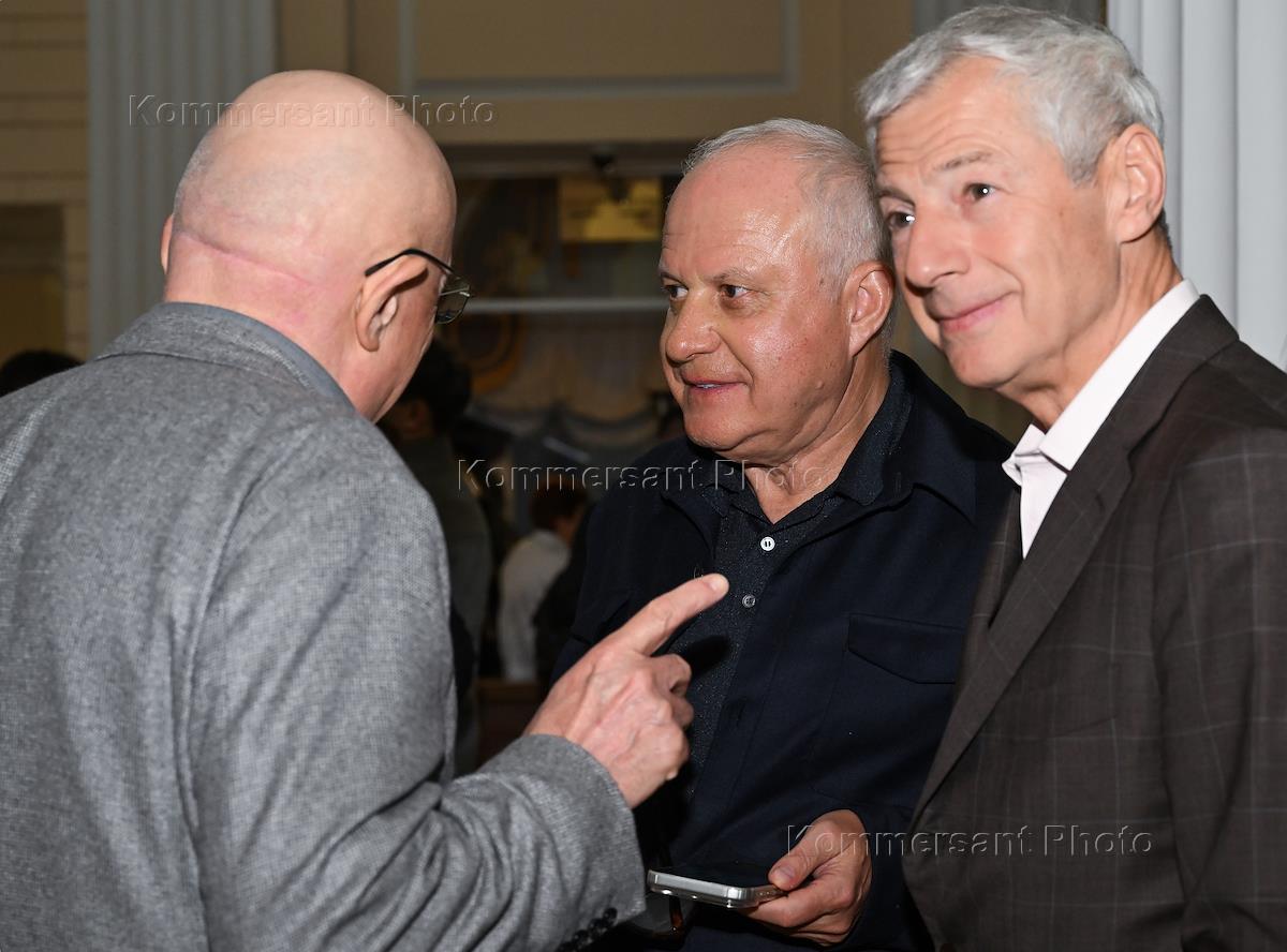 Концерт в честь 90-летия Нижегородского академического театра оперы и балета им. Пушкина при поддержке фонда RA в Большом зале консерватории. Президент группы компаний "Цезарь Сателлит" Леонид Огарев (в центре) и композитор Геннадий Ровнер (справа) перед началом концерта.
