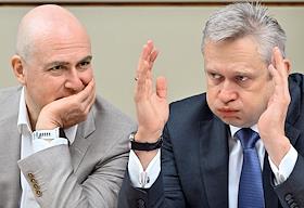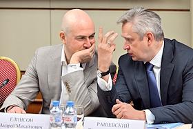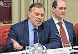 Заседание "круглого стола", посвященного истории отечественного экспорта в Доме Российского исторического общества (РИО). Управляющий партнер инвестиционной компании "А1" Андрей Елинсон (слева) и председатель правления ОАО "СУЭК" Владимир Рашевский (справа) во время заседания.