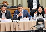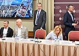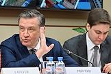 Заседание "круглого стола", посвященного истории отечественного экспорта в Доме Российского исторического общества (РИО). Представитель в Совете Федерации России от законодательного (представительного) органа государственной власти Ульяновской области Сергей Рябухин (слева) во время заседания.