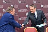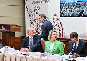 Заседание "круглого стола", посвященного истории отечественного экспорта в Доме Российского исторического общества (РИО). Заместитель министра науки и высшего образования России Константин Могилевский (слева) и член президиума РИО, заместитель начальника Управления информационного и документационного обеспечения президента России Алексей Серегин (справа) во время заседания.
