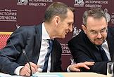 Заседание "круглого стола", посвященного истории отечественного экспорта в Доме Российского исторического общества (РИО). Научный руководитель Института российской истории РАН Юрий Петров (слева) и председатель Российского исторического общества, директор Службы внешней разведки России Сергей Нарышкин (справа) во время заседания.