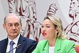 Заседание "круглого стола", посвященного истории отечественного экспорта в Доме Российского исторического общества (РИО). Председатель Российского исторического общества, директор Службы внешней разведки России Сергей Нарышкин (слева) и заместитель министра науки и высшего образования России Константин Могилевский (справа) во время заседания.