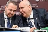 Заседание "круглого стола", посвященного истории отечественного экспорта в Доме Российского исторического общества (РИО). Директор Музея антропологии и этнографии им. Петра Великого (Кунсткамера) Российской академии наук Андрей Головнев (слева) и исполнительный директор фонда "История Отечества" Руслан Гагкуев (справа) во время заседания.