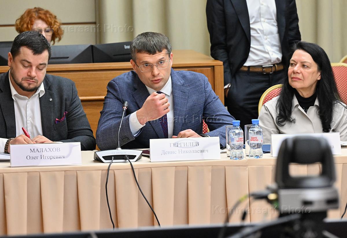 Заседание "круглого стола", посвященного истории отечественного экспорта в Доме Российского исторического общества (РИО). Председатель совета директоров ГК "Праймкей" Олег Малахов (слева) и исполняющий обязанности директора Института российской истории РАН Денис Гергилев (в центре) во время заседания.