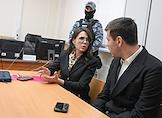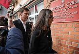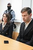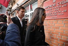 Рассмотрение по существу дела в отношении футболиста Федора Смолова, обвиняемого в причинении вреда здоровью средней тяжести после драки в кафе "Кофемания" на Большой Никитской улице, в 418-м судебном участке Москвы. Футболист Федор Смолов (в центре) и супруга Карина Смолова (Истомина) (справа) перед началом заседания суда.