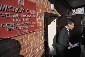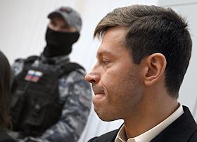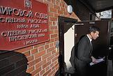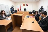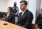 Рассмотрение по существу дела в отношении футболиста Федора Смолова, обвиняемого в причинении вреда здоровью средней тяжести после драки в кафе "Кофемания" на Большой Никитской улице, в 418-м судебном участке Москвы. Футболист Федор Смолов (справа) во время заседания суда.