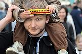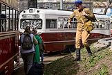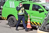 Парад исторических трамваев по маршруту от Курского вокзала до улицы Сергия Радонежского. Жанровая фотография. Сотрудник службы ЦОДД у автомобиля службы "Дорожный патруль".