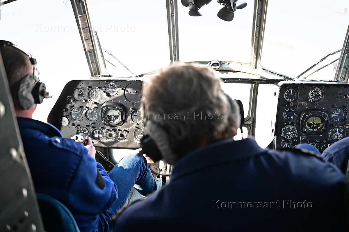 Тренировка десантников-пожарных на вертолетной базе "Хелипорт-Новосибирск" в селе Барлак Новосибирской области. Десантирование с вертолета МИ-8 в рамках подготовки парашютно-десантной пожарной службы Новосибирской базы авиационной охраны лесов к пожароопасному сезону. Пилоты в кабине вертолета.