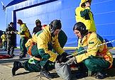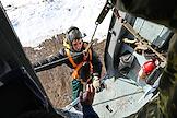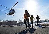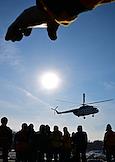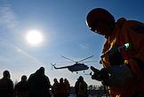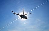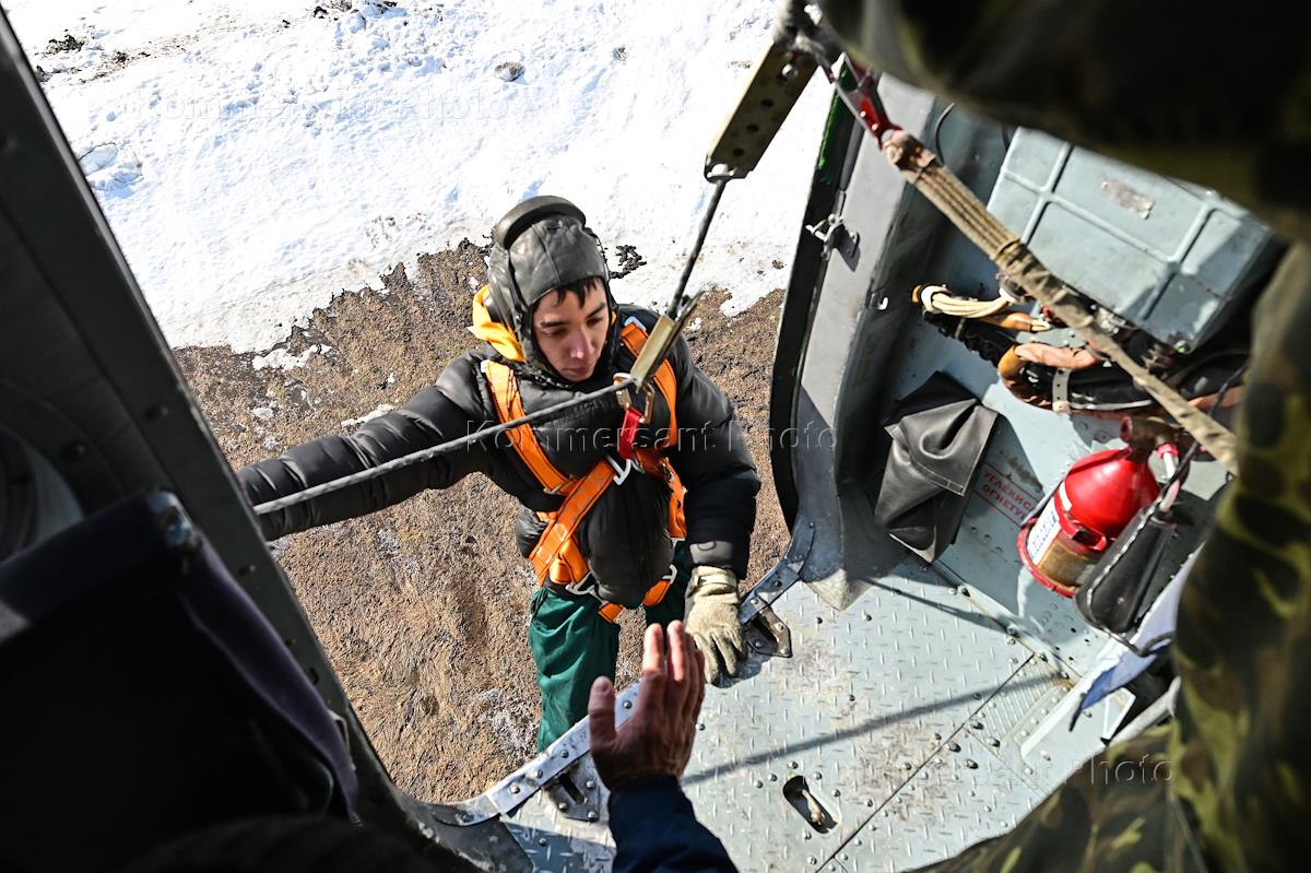 Тренировка десантников-пожарных на вертолетной базе "Хелипорт-Новосибирск" в селе Барлак Новосибирской области. Десантирование с вертолета МИ-8 в рамках подготовки парашютно-десантной пожарной службы Новосибирской базы авиационной охраны лесов к пожароопасному сезону. Жанровая фотография.