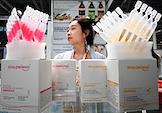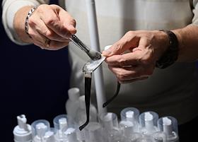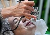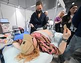 Межсезонная парфюмерно-косметическая выставка для российских брендов и производителей R-BEAUTY от interCHARM в Международном выставочном комплексе "Крокус Экспо". Жанровая фотография. Стенд проведения подкожных инъекций на лице.