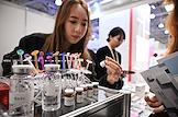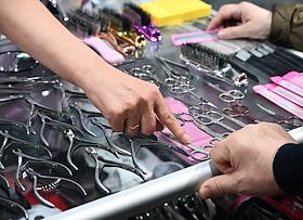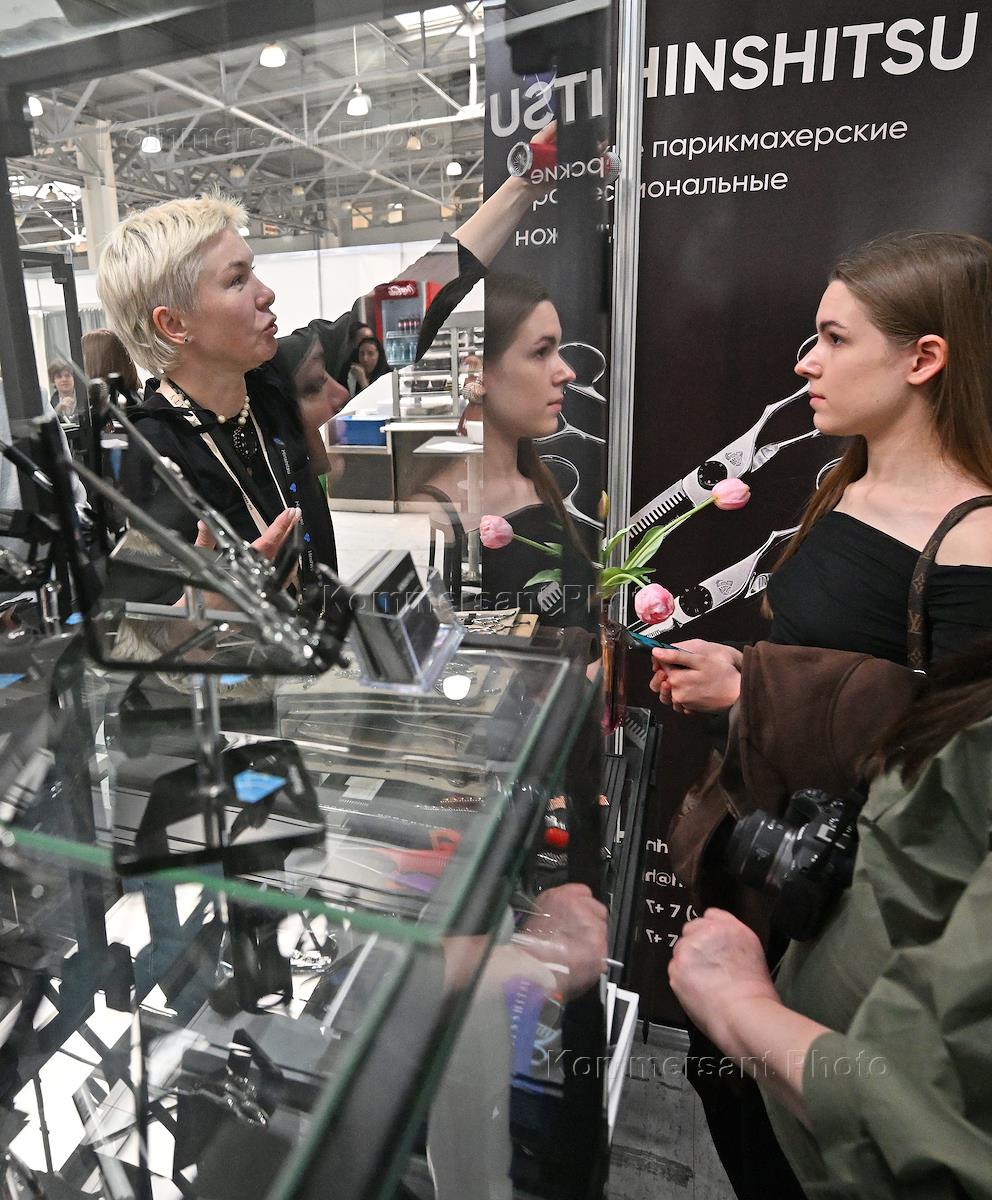 Межсезонная парфюмерно-косметическая выставка для российских брендов и производителей R-BEAUTY от interCHARM в Международном выставочном комплексе "Крокус Экспо". Жанровая фотография. Стенд производителей аппаратуры для ногтевого сервиса.