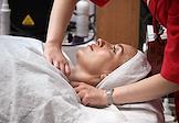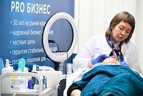 Межсезонная парфюмерно-косметическая выставка для российских брендов и производителей R-BEAUTY от interCHARM в Международном выставочном комплексе "Крокус Экспо". Жанровая фотография. Стенд проведения косметических процедур.