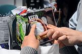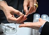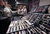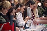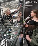 Межсезонная парфюмерно-косметическая выставка для российских брендов и производителей R-BEAUTY от interCHARM в Международном выставочном комплексе "Крокус Экспо". Жанровая фотография. Посетители у стенда с солнцезащитными очками.
