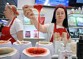 Межсезонная парфюмерно-косметическая выставка для российских брендов и производителей R-BEAUTY от interCHARM в Международном выставочном комплексе "Крокус Экспо". Жанровая фотография. Стенд производителей воска для депиляции Italwax.