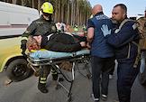 Межведомственные учения по ликвидации последствий массового ДТП на автодороге Р-351. Сотрудник ДПС ГИБДД на трассе. Сотрудники Службы спасения и Медицины катастроф во время госпитализации пострадавшего в ДТП пассажира автомобиля.