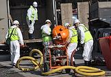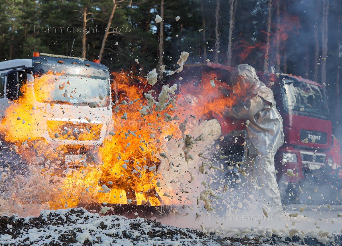 Межведомственные учения по ликвидации последствий массового ДТП на автодороге Р-351. Сотрудники пожарной службы во время тушения пеной огня от горения горючего.